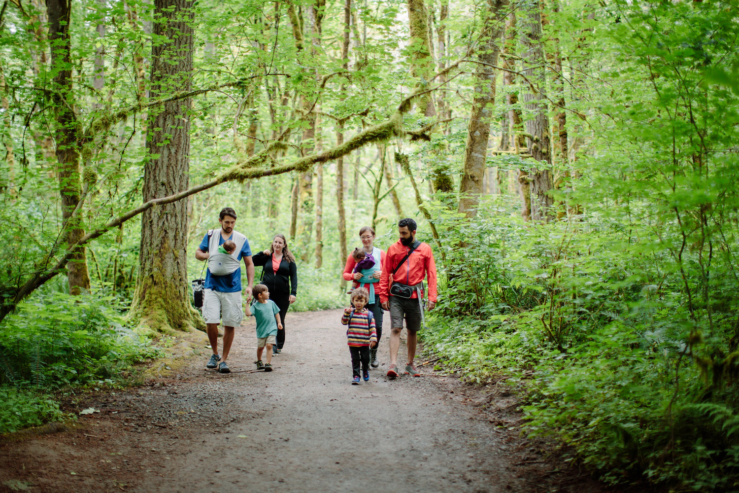Once, you might have had a quiet little baby who was happy to gaze up at the sunlight streaming through the leaves in the trees, but now he’s 3. This means he’s in the “it’s all about me and my way” phase. Expect some serious patience and negotiating at times. For this, I suggest bribes and toys. Keep them handy for distractions and to get you moving. Do you have more than one kid? Sometimes, that can be a good thing, as multiple kids will keep each other going on trail. But it can also mean you’ll want to be more aware of the trails you are picking so you don’t have a mini heart attack when your 4-year-old decides to take off while you are changing a super poopy diaper. To keep pre-kindergarten-age kids in check while you’re on the ground wrestling with wet nappies, bring a toy like a magnifying glass and have your 4-year-old tell you all they can see on the ground. No toys? Ask them to find five shades of green for you in the surroundings. Bringing grandparents along? Consider the terrain and if there are roots or rocks they might have to step over. While a grandparent might do great on sidewalks, uneven terrain requires more muscle. There are many trails that can accommodate canes or walkers. The same thing goes for little ones who are new to walking. Smoother trails with bark or firm dirt are easier to negotiate than loose gravel. Also, look for trails with benches or good stumps for resting. This can be a boon for nursing parents.