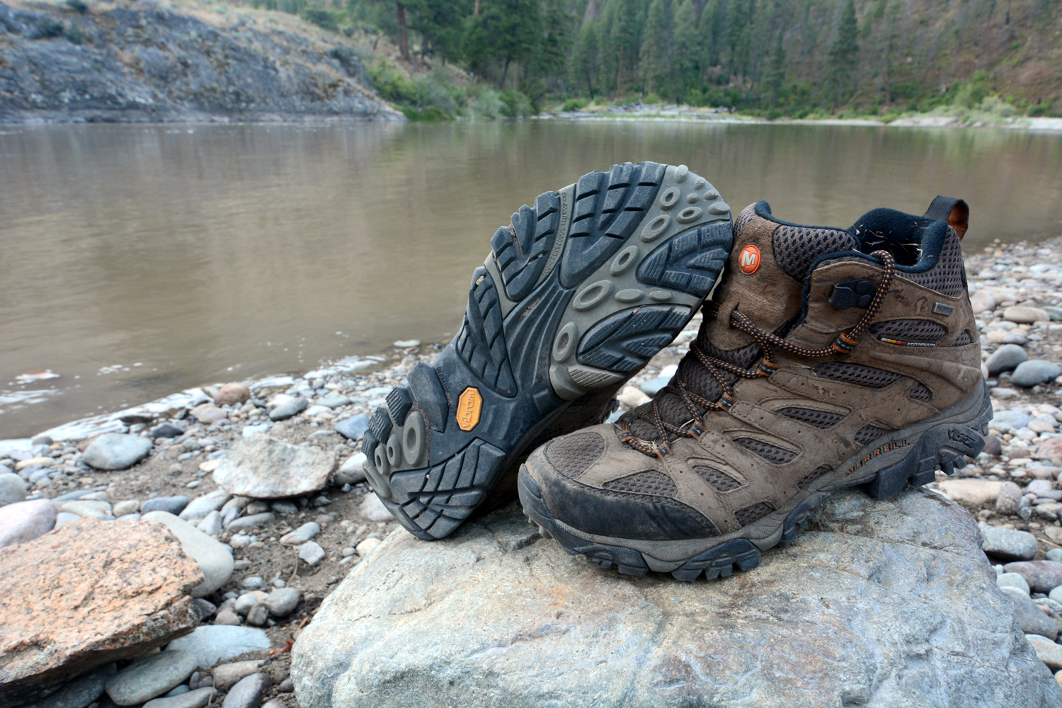 I wore the Moab Mid Waterproof Hiking Boot on several hikes during a week-long July rafting trip down Idaho’s Middle Fork of the Salmon River. The hikes included a 27-mile day hike with about 3,200 feet of uphill and downhill on the Middle Fork Salmon River Trail between Boundary Creek and Indian Creek; a 10-mile trek with one significant hill climb; a late-afternoon 1,400-vertical-foot hike up and down the steep trail to Johnson Point, high above the Middle Fork; and some shorter side hikes off the river. All of those hikes occurred in sunny, warm, dry conditions, except that on the long day hike, I walked through about an hour of heavy rain during an afternoon thunderstorm, and earlier that day, the boots’ exterior had already gotten wet from brushing against trail-side vegetation that was waterlogged from rain the previous night. I also splashed through boggy areas on that big day.